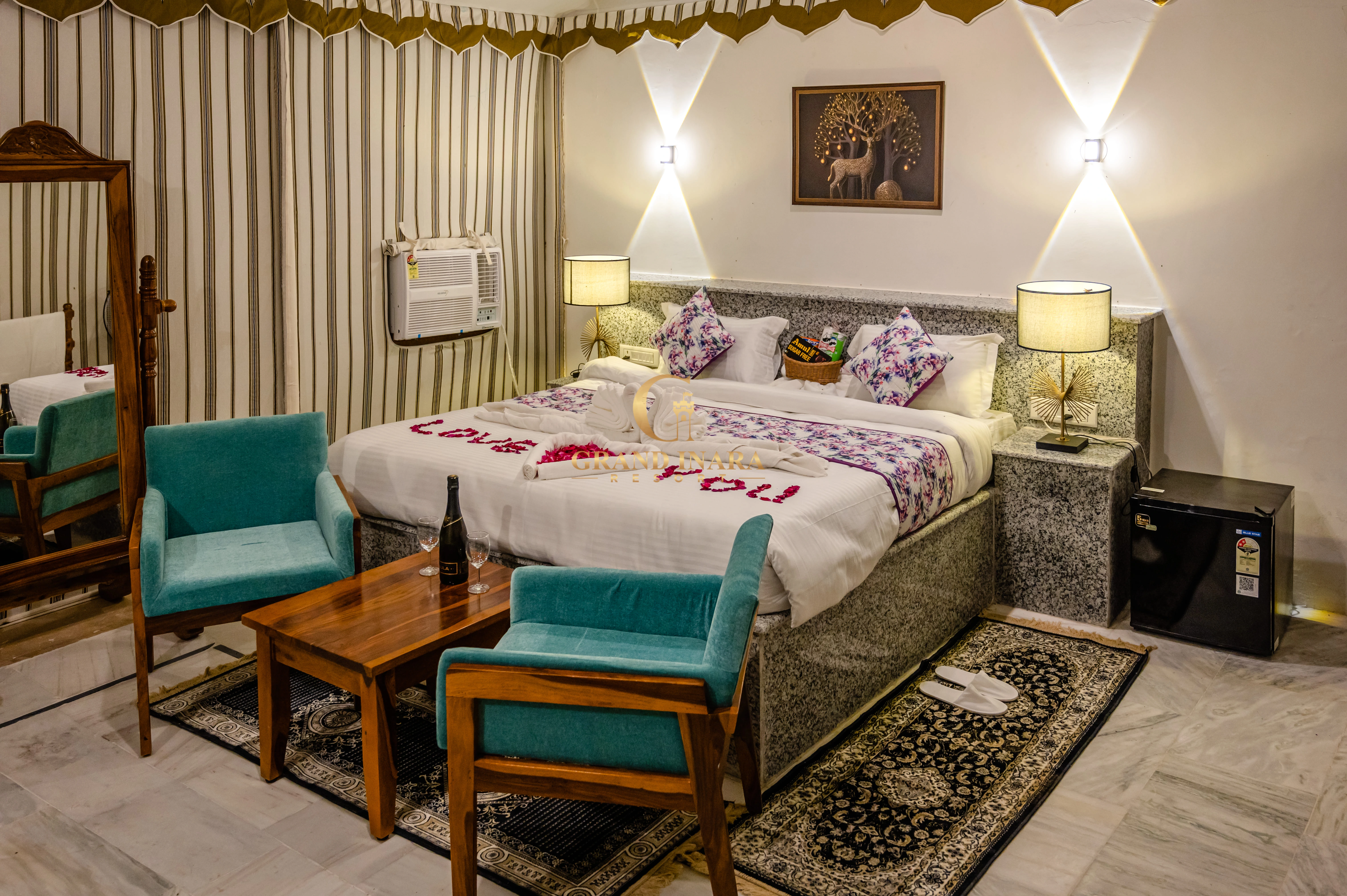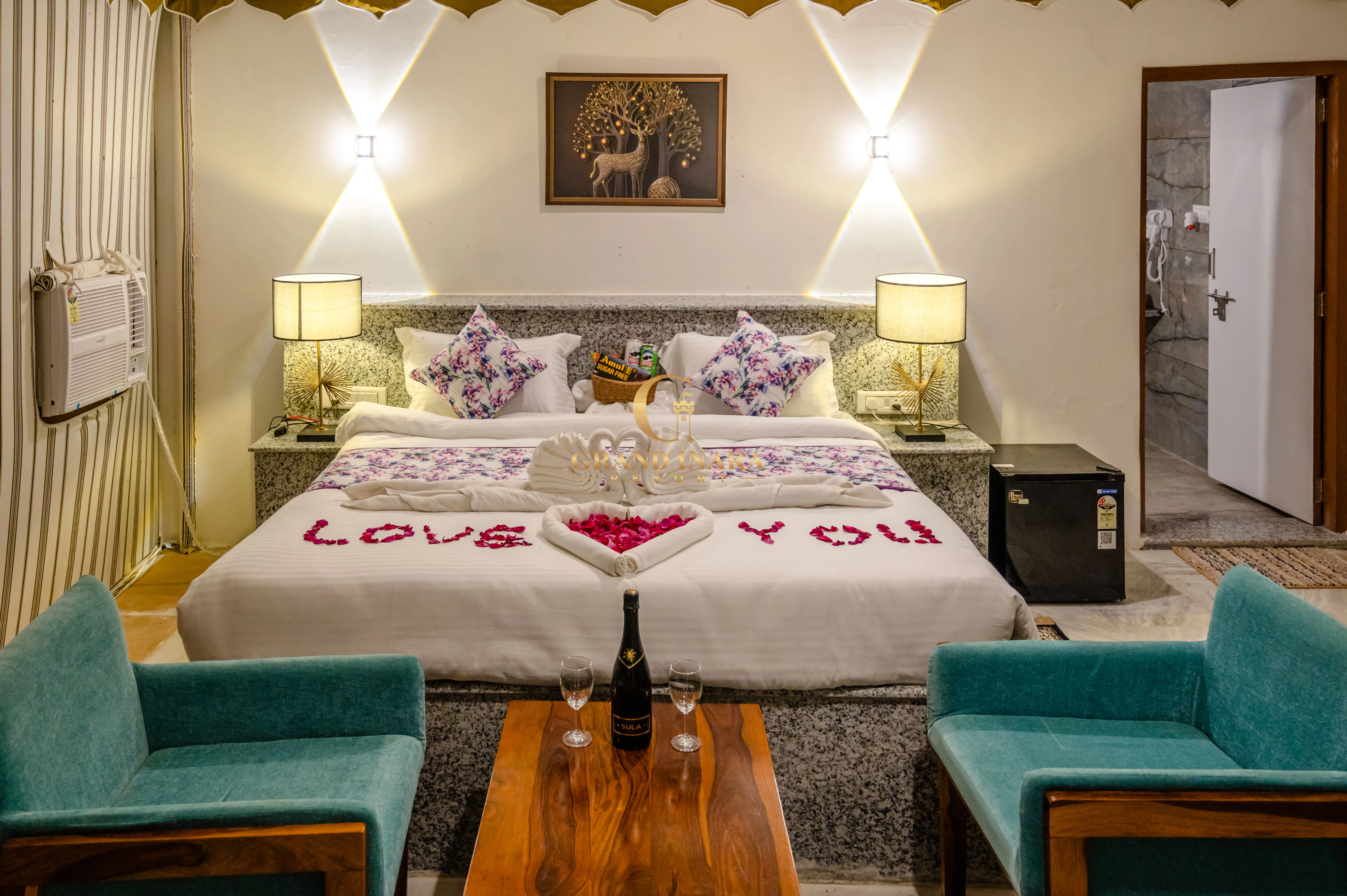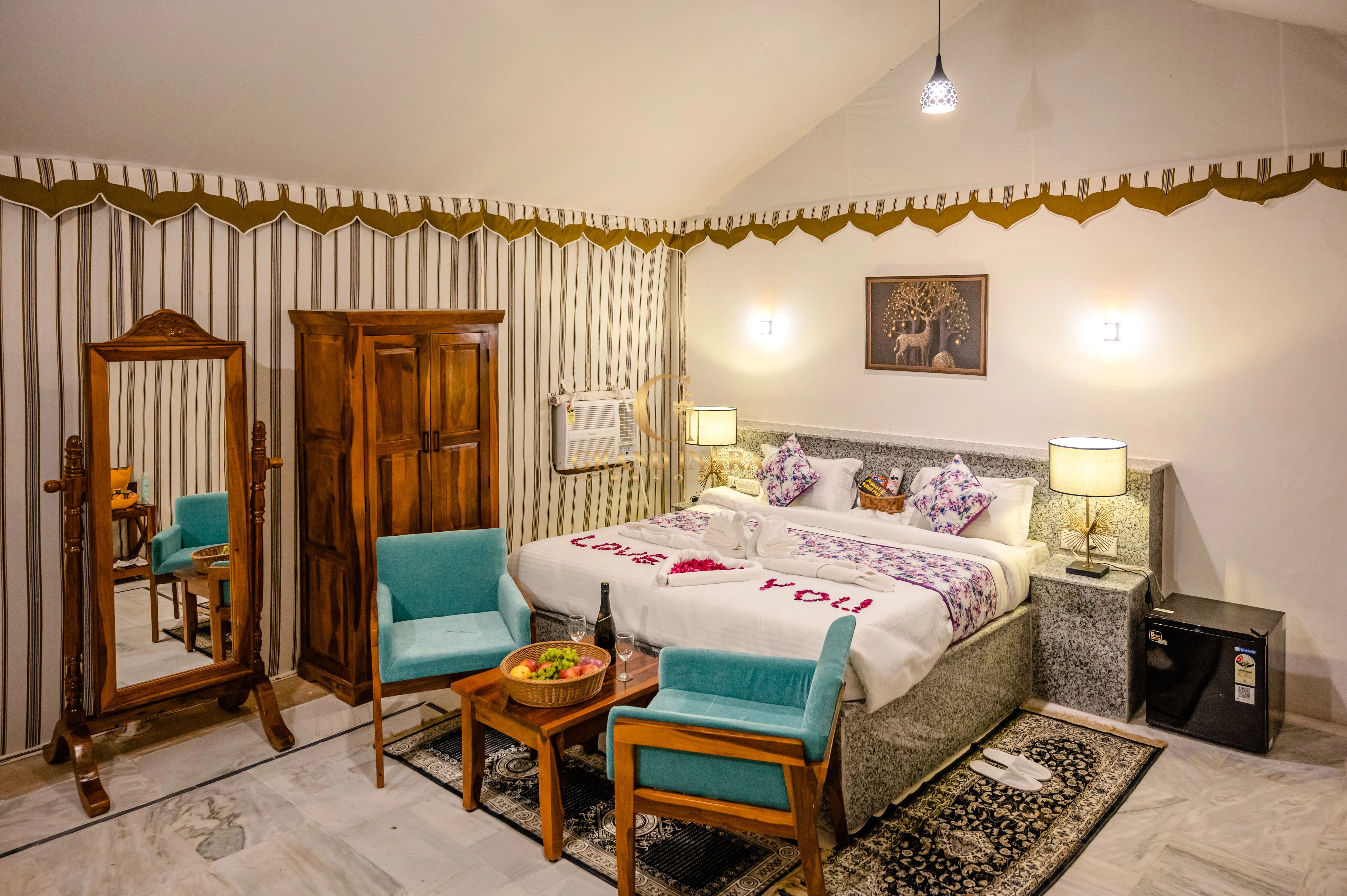 The Grand Inara Couple Suite is an intimate and luxurious retreat designed for romance and relaxation. This elegantly appointed suite features a spacious bedroom with a plush king-sized bed, draped in premium linens, and a cozy sitting area. Soft, warm lighting and rich, earthy tones create a serene atmosphere. The suite includes a private balcony with breathtaking views, perfect for enjoying a quiet moment together. The lavish bathroom offers a deep soaking tub, a rain shower, and dual vanities. Ideal for couples, this suite provides a perfect blend of comfort, privacy, and luxury.